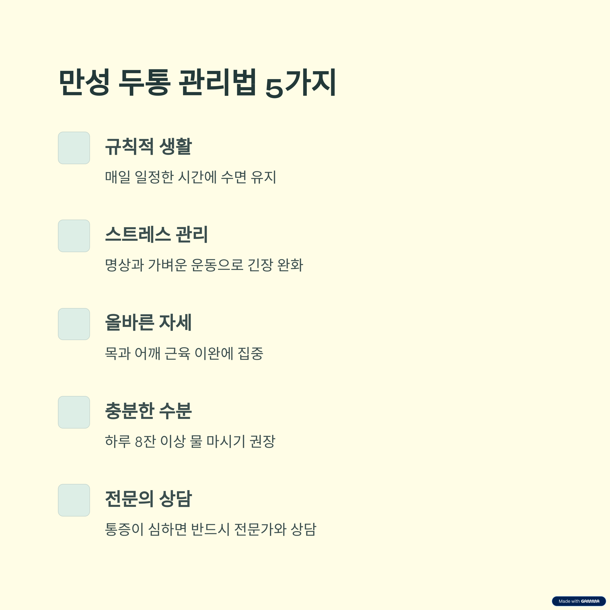 주의: 본 내용은 일반적인 두통 관리 지침이며, 개인의 건강 상태에 따라 다를 수 있으니 의사와 상담하세요.