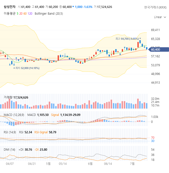 자, 이제 가장 궁금해하실 삼성전자의 일봉 차트를 볼 시간입니다. 차트는 우리에게 많은 이야기를 들려주곤 하죠. 현재 삼성전자의 주가는 61,400원 선에서 거래되고 있으며, 52주 최저점 52,900원 대비 14.18% 상승한 상태입니다. 하지만 최근 고점인 64,700원 대비해서는 6.65% 하락한 상태를 보여주고 있습니다.
