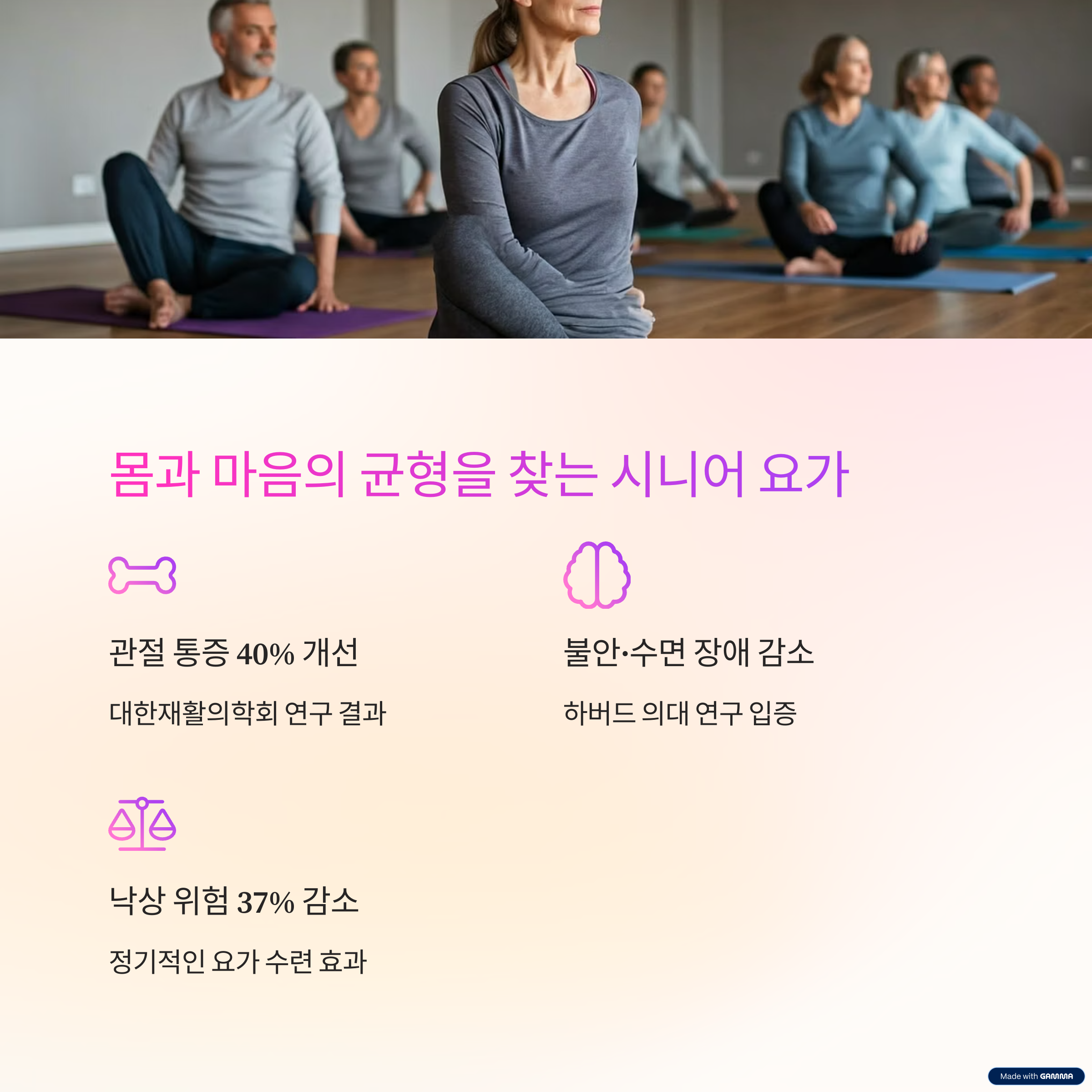 그렇다면 ‘시니어 맞춤 요가’가 제격입니다. 전문가 지도 하에 간단한 동작만으로도 근육을 강화하고 유연성을 키울 수 있어요.