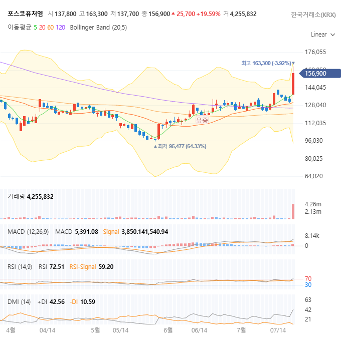 현재 주가 (종가) 2025년 7월 19일 기준 마감 가격 일봉 차트 기준 156,900원