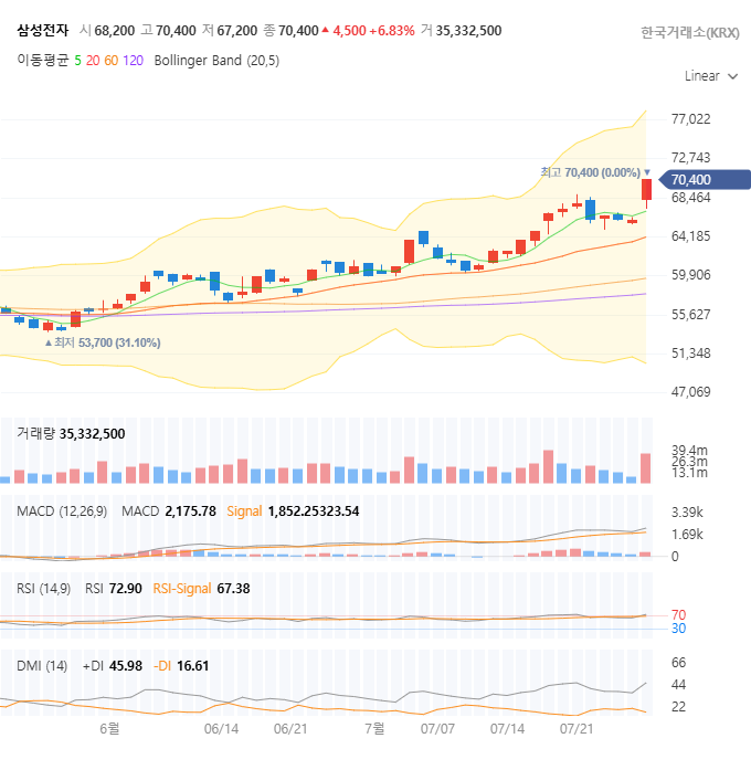 자, 이제 가장 궁금해하실 삼성전자 차트를 볼 시간입니다. 7월 26일 종가는 70,400원으로 마감했으며, 최근 70,400원까지 최고가를 기록하며 견조한 상승세를 보이고 있습니다.