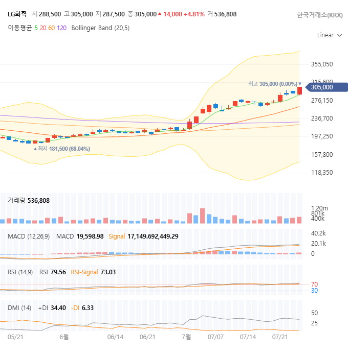 LG화학은 전통적인 화학 사업의 안정성과 함께 배터리 소재, 친환경 소재 등 미래 성장 동력을 확보하며 변화하고 있는 기업입니다. 단기적인 기술적 지표는 과열 신호를 보이기도 하지만, 장기적인 관점에서는 충분한 성장 잠재력을 지니고 있습니다.